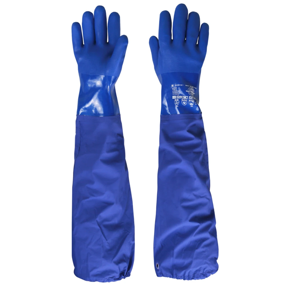 Материал: ПВХ, Внутр. покрытие: интерлок 100% хлопок, дл. 260мм+нарукавник 400мм., толщ. 1,6мм перчатка, Рабочая поверхность: песок на кисти и пальцах, для работ с продуктами нефтепереработки (бензин, керосин, масла), щелочами и кислотами, К80, Щ40. Высокая прочность и износостойкость.